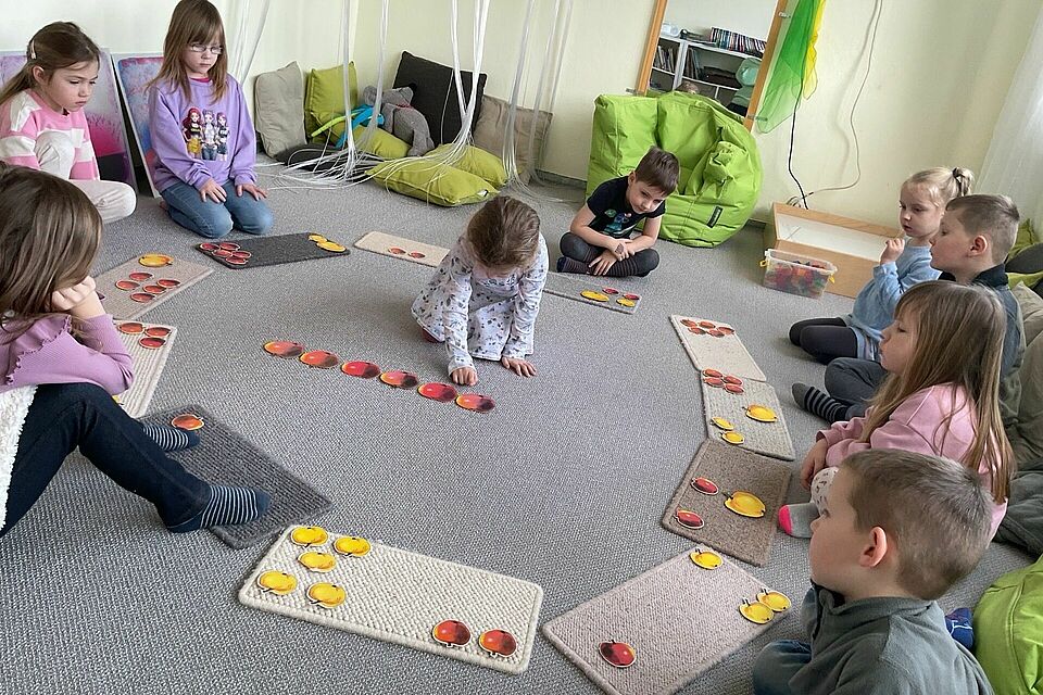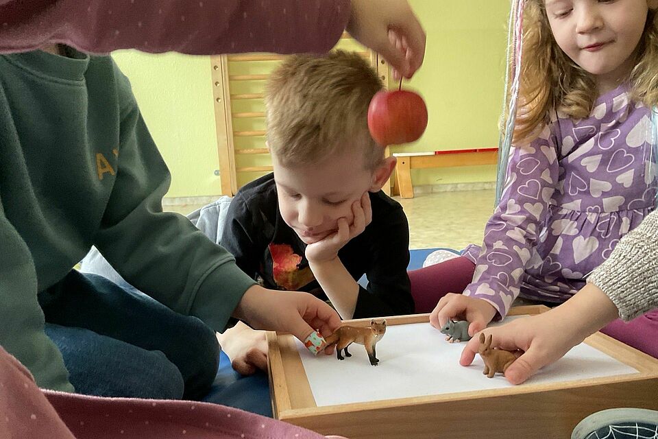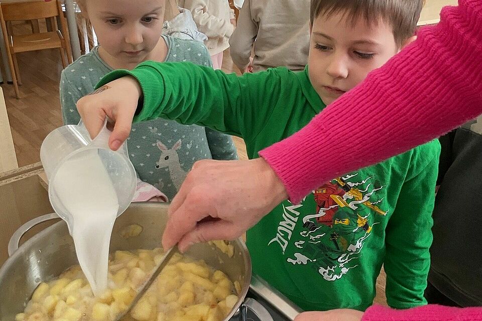 Wir haben die Geschichte „Ein Apfel für alle“ zum Ausgangspunkt genommen und die Kinder eingeladen, selbst aktiv zu werden. Es wurde geschnippelt, gerührt und probiert: beim Apfelkompott zubereiten konnten alle beobachten, wie aus rohen Äpfeln etwas Köstliches entsteht. Auch beim Lernspiel mit Äpfeln gab es viel zu staunen – wie groß oder klein sind sie, welche Farben haben sie, wie viele Stücke passen auf einen Teller?