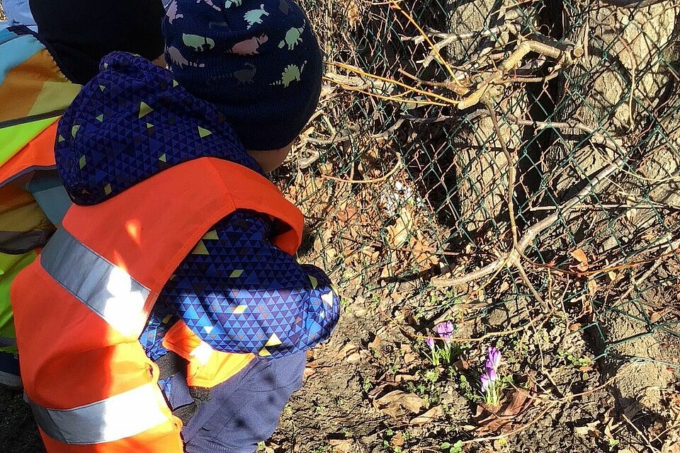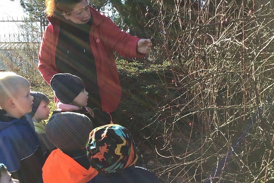 Nicht nur Blumen begeisterten uns: In einer Hecke tobte eine Spatzenschar, deren fröhliches Zwitschern uns wie ein lebendiger Soundtrack begleitete. Über unseren Köpfen flogen Wintervögel vorbei, und wir staunten gemeinsam über das geschäftige Treiben in der Luft. Für uns als Team ist es immer wieder ein Glück, die Kinder auf solchen Expeditionen zu begleiten: Wir erklären, fragen, staunen zusammen – und erleben, wie aus einfachen Spaziergängen kleine Abenteuer werden, die Neugier und Forschergeist wecken.
