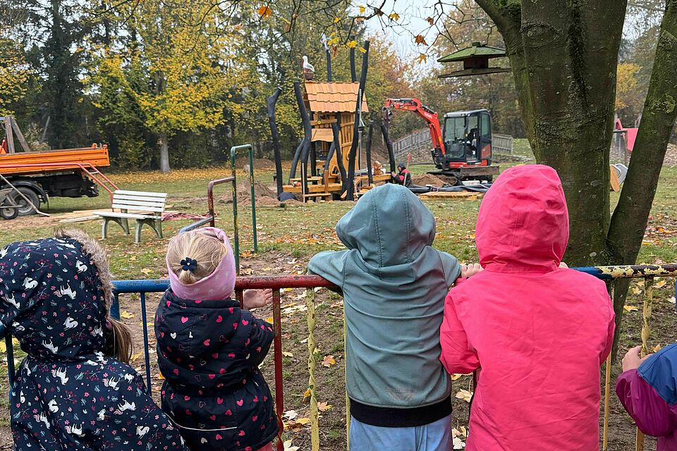 Was für ein Spektakel! Schon früh am Morgen war der Spielplatz das spannendste Beobachtungsfeld weit und breit. Mit lautem Getöse rückten Transporter, Minibagger und Kran an – und wir Moosterzwerge waren natürlich mittendrin statt nur dabei. Jedes Rumpeln, jedes Klirren und jedes Anheben eines Balkens wurde fachkundig kommentiert, neugierig hinterfragt und begeistert bejubelt. Wir staunten, wie Stück für Stück unsere “Bieberburg” Gestalt annahm – und konnten uns kaum von dem Schauspiel lösen.