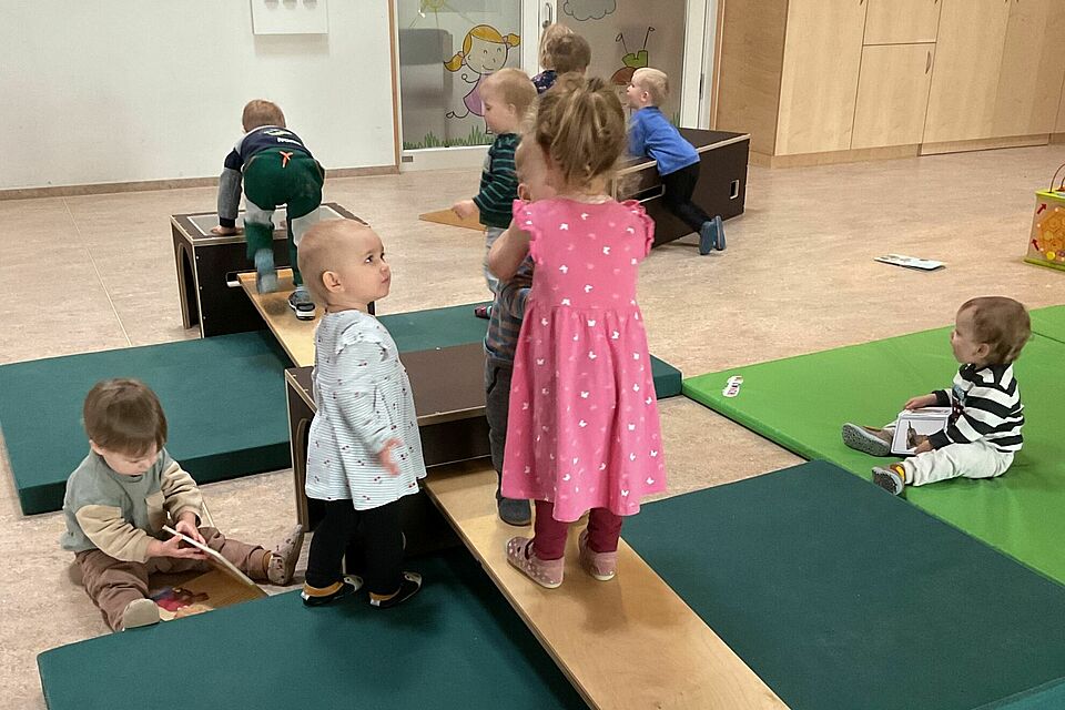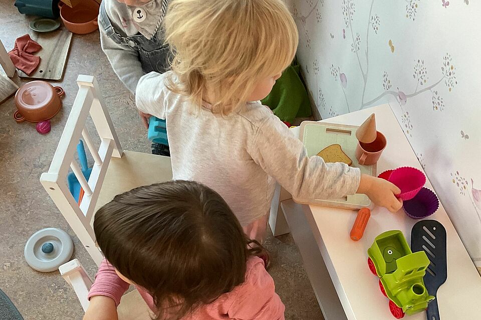 Das Regenwetter nutzten wir, um unsere Gruppenräume umzudekorieren. Plötzlich wurden bekannte Ecken zu spannenden Spiellandschaften, und die neue Bewegungsstrecke verwandelte sich in ein echtes Abenteuerparcours. Im Puppenraum dagegen ging es ruhig und gemütlich zu. Hier wurde gekocht, eingekauft, angezogen, spazieren gefahren – und natürlich das Schlafengehen der Puppen sorgfältig organisiert. So konnten die Kinder alltägliche Abläufe nachspielen, sich ausprobieren und ihre Sozialkompetenz stärken.