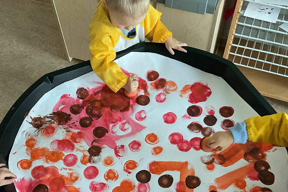 Auch im Kreativraum wurde es bunt und rund: Mit Tupfern entstand auf einem großen Papier eine ganze Herbstbaumkrone. Jeder Farbtupfer ein kleines Statement, jeder Pinselstrich ein Ausdruck der eigenen Fantasie. Am Ende des Tages leuchtete das Papier wie ein Regenbogen – genau wie die strahlenden Augen unserer Kinder.