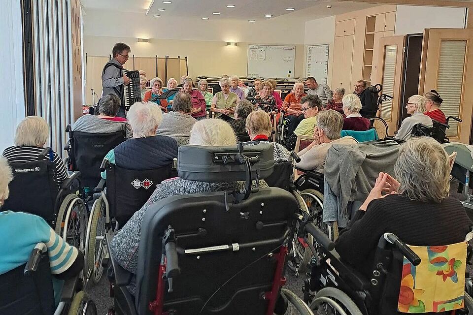 Der Vormittag gehörte ganz unseren Bewohnerinnen. Herr Hahn sorgte mit witzigen Geschichten für herzhaftes Lachen und brachte mit Gesang und Akkordeon die Stimmung zum Kochen. Fröhliche Melodien und gemeinsames Mitsummen machten den Tag unvergesslich – eine Feier, die nicht nur den Ohren, sondern auch dem Herz gut tat.