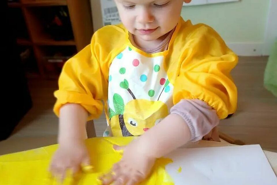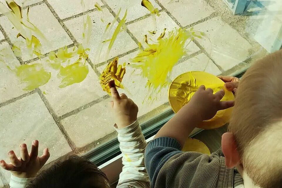 Aus dieser Neugier heraus entstanden gelbe Kunstwerke: Finger, Hände und ganze Entdeckerfreude fanden ihren Weg auf Papier und Fensterflächen. Gelbe Bausteine wuchsen zu Türmen, die genauso schnell fielen, wie sie gebaut wurden – begleitet von viel Gelächter und noch mehr Wiederholungsversuchen. In selbstgemachten Sensorikbeuteln wurde gedrückt, gestaunt und gefühlt.
