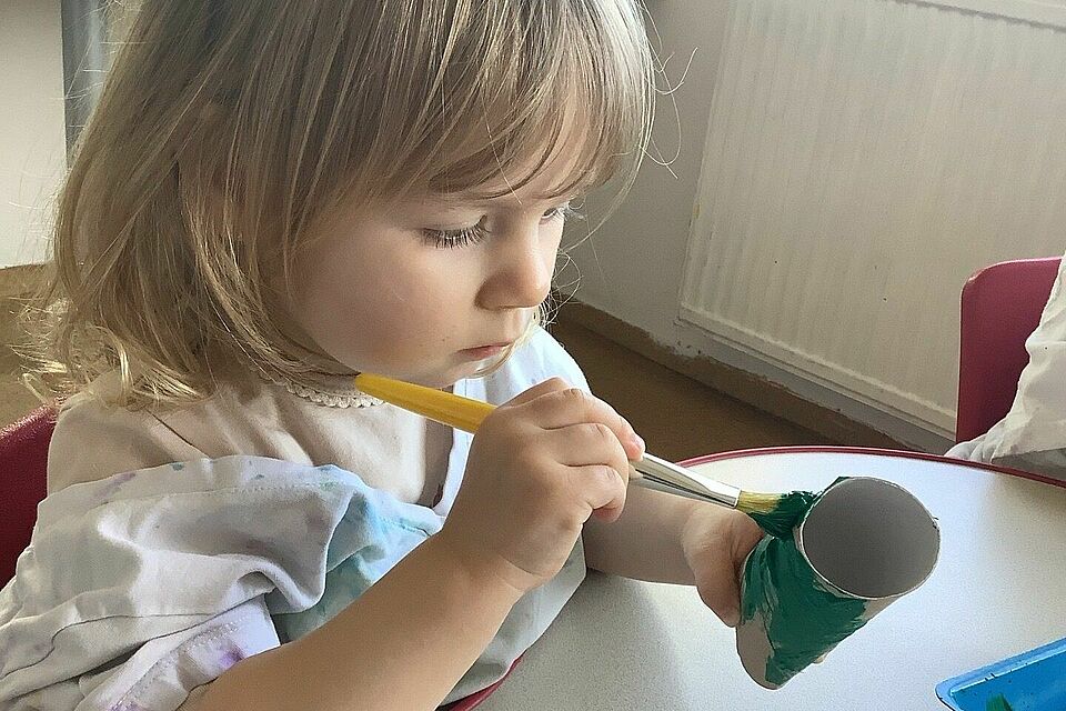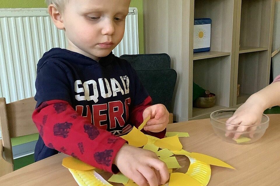 Unsere kleinen „Käfer“ haben sich voller Elan daran gemacht, den Frühling auch in unseren Gruppenräumen lebendig werden zu lassen. Aus Papprollen und Krepppapier entstanden zarte Hyazinthen, die unsere Tische schmücken, während bunte Blumen aus Farbe und Eierkartons fröhlich um die Wette leuchten. Mit Papptellern, gelber Farbe, Klebestreifen und Tonkarton haben wir Sonnen gebastelt, die nun von den Decken strahlen – ein kleiner Sonnenregen für unsere Herzen. Dabei beobachten wir, wie Konzentration, Geduld und die Freude am Selbermachen Hand in Hand gehen.