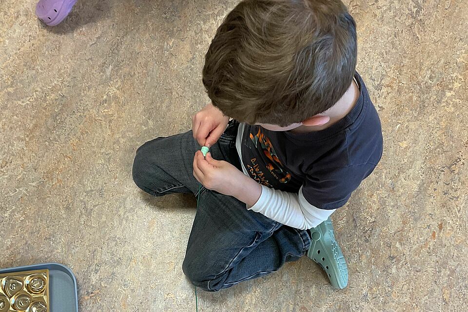 Im Kreativraum wurde es anschließend lebendig. Die Aktionstabletts luden zum Ausprobieren ein: Fädeln, Sortieren und erstes Entdecken von Zahlen und Farben geschah ganz spielerisch. Dabei zeigte sich immer wieder, wie viel Freude im eigenen Tun steckt – und wie aus kleinen Impulsen große Ideen wachsen.