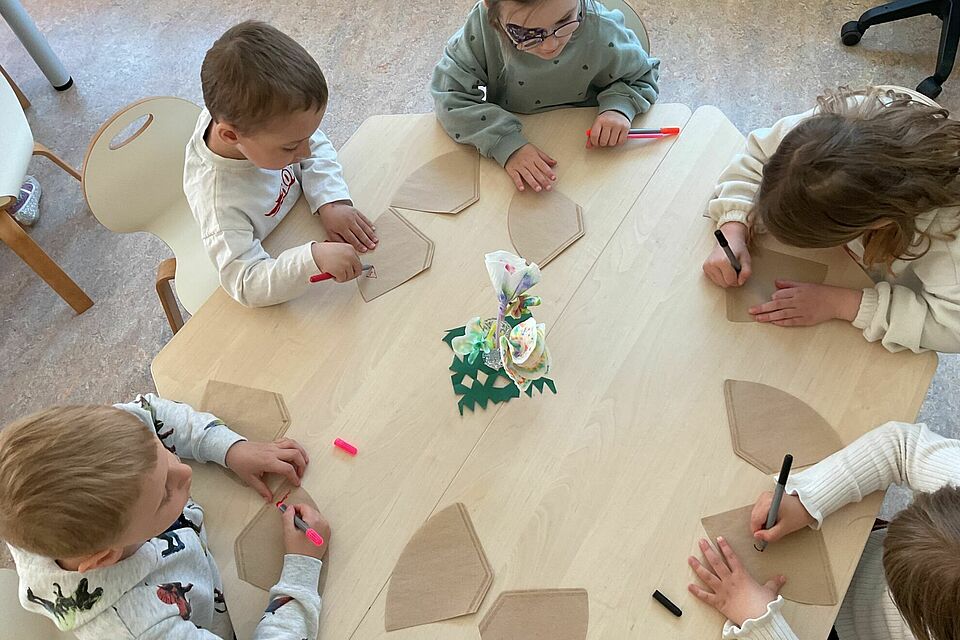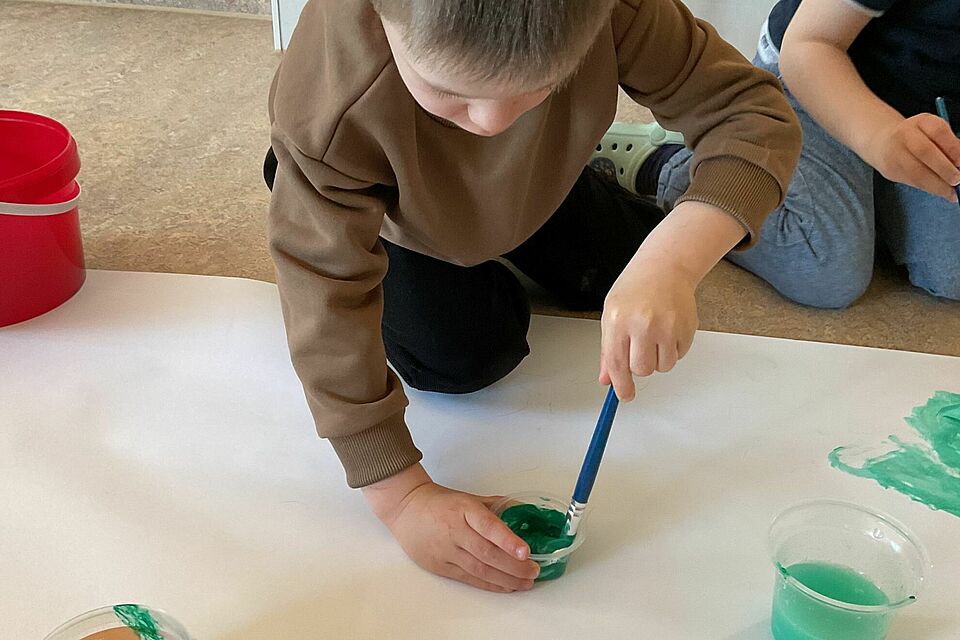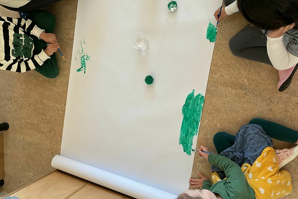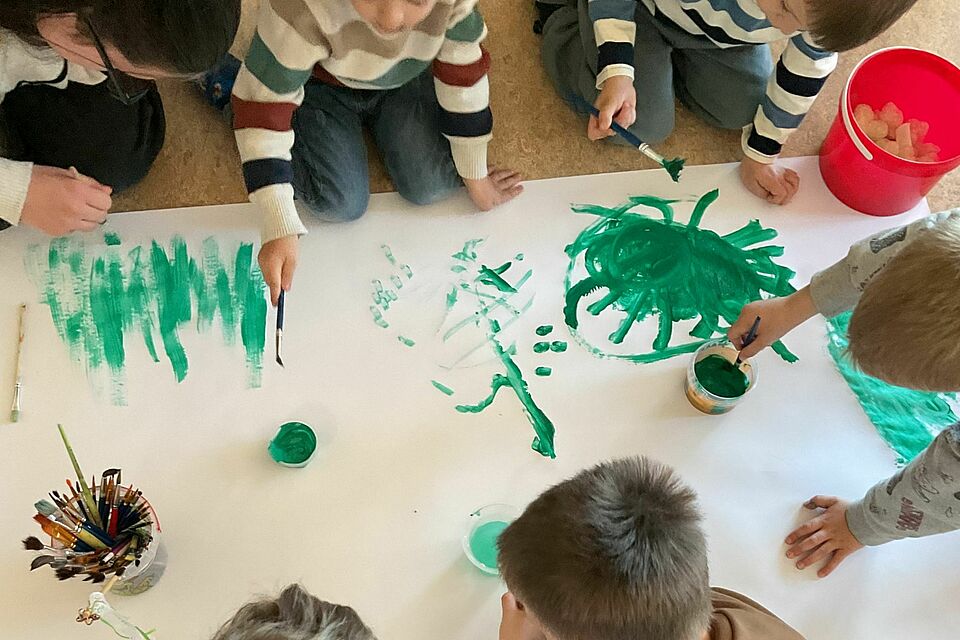Ein besonderes Highlight war der Start eines gemeinsamen Projekts: die Frühlingswiese. Mit viel Geduld verwandelten die Kinder eine große Papierfläche in ein lebendiges Grün. Dabei wurde gemischt, ausprobiert und gestaunt – denn schnell wurde klar: Grün hat viele Facetten. Jede neue Farbnuance war ein kleiner Erfolg, der sichtbar machte, wie Lernen durch eigenes Erleben entsteht.