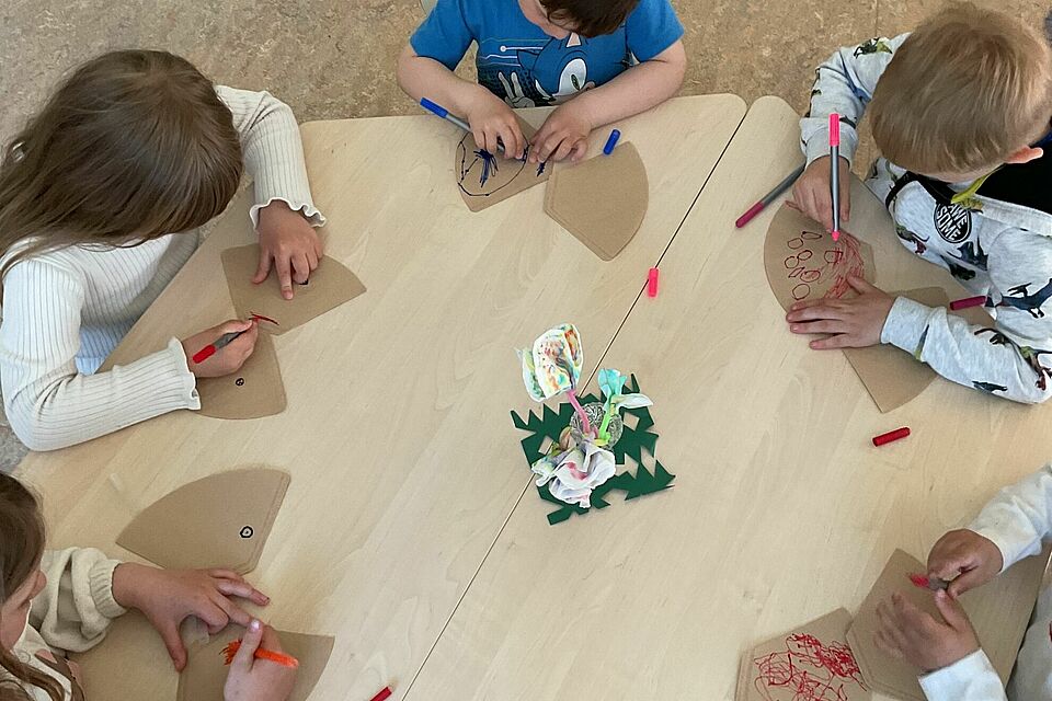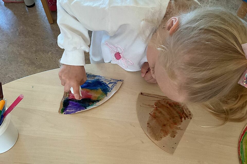 Auch die Schmetterlinge brachten Staunen in den Alltag. Mit bunten Stiften gestalteten die Kinder ihre eigenen Flügel. Als Wasser hinzukam, verliefen die Farben ineinander und es entstanden einzigartige Muster. Jeder Schmetterling erzählte seine eigene kleine Geschichte.