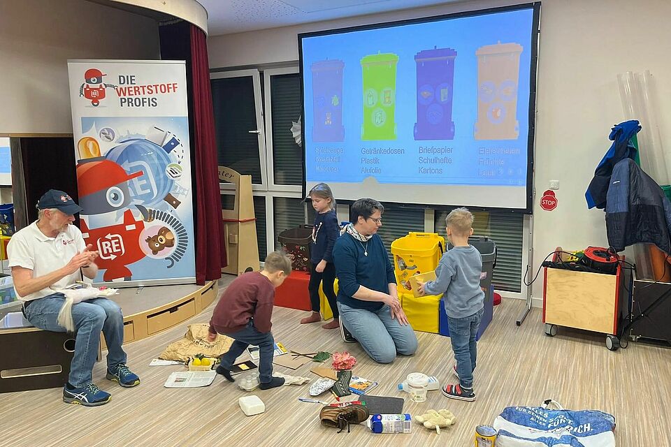 Gespannt und voller Tatendrang zählten die Kleinen den Countdown bis zum Start der Veranstaltung herunter. Mit Applaus wurden Jürgen und Friedhelm empfangen, die zusammen mit dem virtuellen Roboter Robin durch das Programm führten. Kindgerecht und unterhaltsam vermittelten sie Wissen rund um die Themen Mülltrennung und Recycling. Das junge Publikum machte eifrig mit.