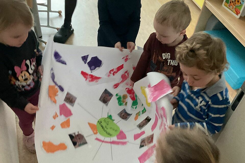 Schon beim ersten Treffen legten die Kinder los wie kleine Abenteurer: Mit selbstgewählten Lieblingsfarben tupften sie ihre Fußabdrücke und erschufen so persönliche Kunstwerke. Doch das war erst der Anfang – aus allen Schnipseln entstand ein riesiges Gemeinschaftsplakat. Beim Schneiden und Kleben übten die Kinder nicht nur ihre Feinmotorik und Konzentration, sondern entdeckten auch, wie schön es ist, gemeinsam etwas Einzigartiges zu gestalten.