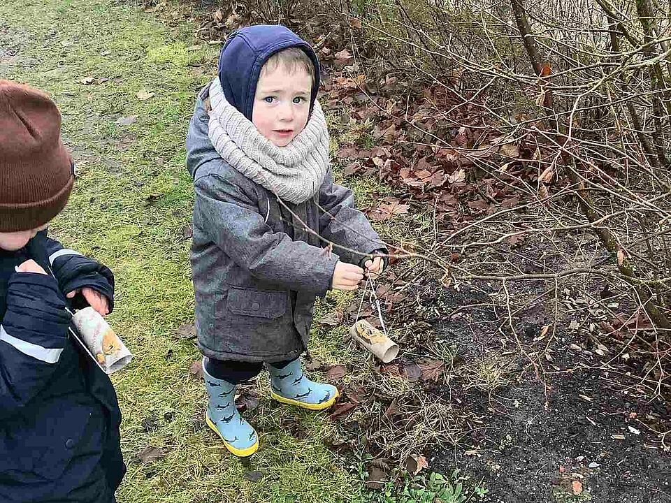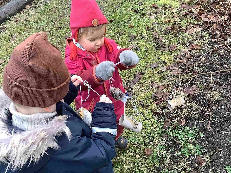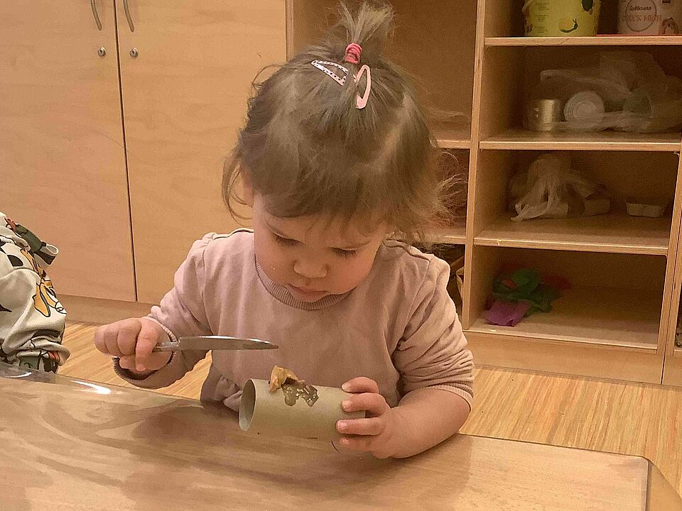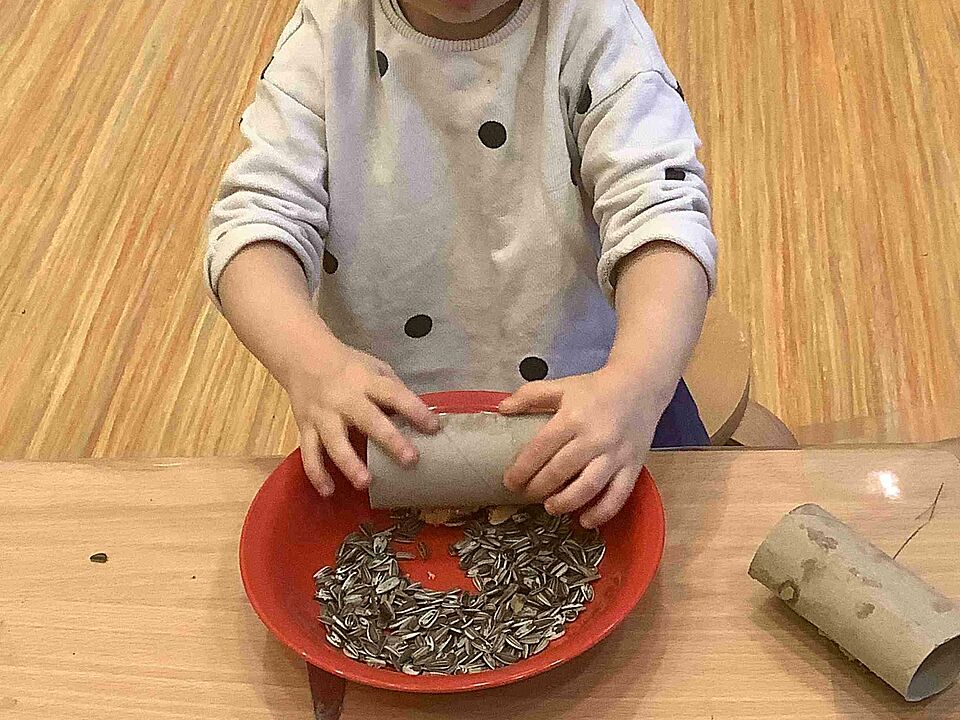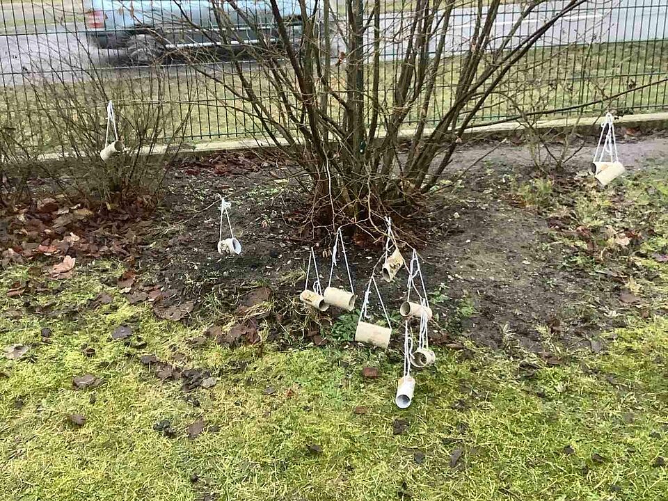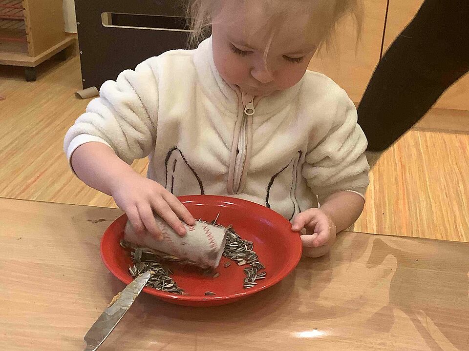 Das Highlight der Woche war das Basteln einer Vogelfutterstation. Mit viel Fingerspitzengefühl wurden Toilettenpapierrollen mit Erdnussbutter bestrichen und in Sonnenblumenkernen gewälzt. Die fertigen Futterrollen hängten die Kinder eigenhändig in den Garten – natürlich mit gespannter Erwartung, wann der erste Vogel vorbeischaut.