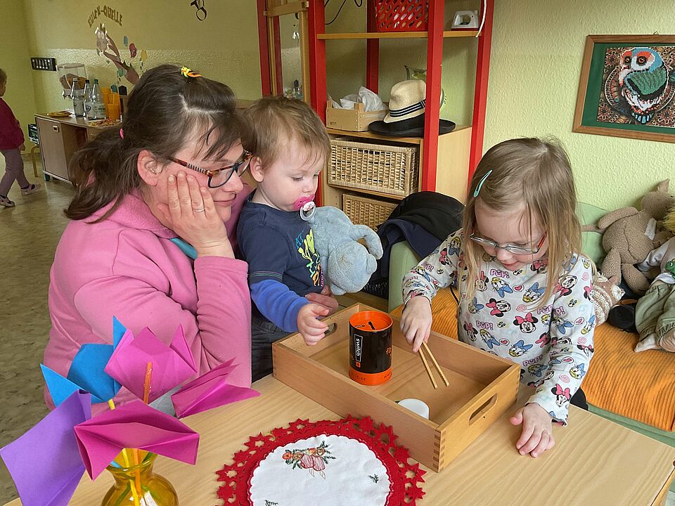 Die Lieblingsbücher konnten mitgebracht werden und es wurden tolle Geschichten von den Mamas und Papas in gemütlicher Runde vorgelesen. Zwischendurch gab es auch Zeit, um etwas zu knabbern. Nach dem Vorlesen nutzten die Kinder die Zeit, ihren Eltern ganz stolz die frisch gestalteten Lerntabletts nach Montessori zu zeigen und mit ihnen das selbst hergestellte Gruppenmemory zu spielen. Zum Abschied konnten alle ihre Erinnerungen an die intensive gemeinsam erlebte Zeit und vielleicht ein paar Anregungen für zu Hause mitnehmen.