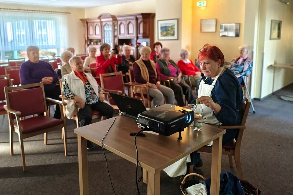 Das Sternberger Waschweib Radka besuchte uns im Betreuten Wohnen und nahm uns mit auf eine virtuelle Entdeckungstour durch ihre Heimatstadt. Mit liebevoll zusammengestellten Fotos führte sie uns durch verwinkelte Gassen, historische Plätze und besondere Orte, die Sternberg prägen. Wir erlebten, wie viel Geschichte in den alten Mauern steckt und wie lebendig sie durch Radkas Erzählungen wurde.