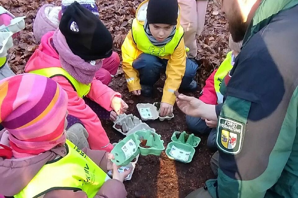Jannik bereitete einen kleinen Abschnitt des Waldbodens für uns vor – und es dauerte nicht lange, bis wir das rege Treiben darin entdeckten. Käfer, Würmer und Keimlinge sorgten für leuchtende Augen und spannende Fragen der Kinder.
