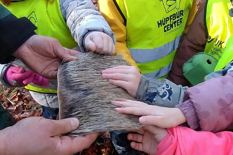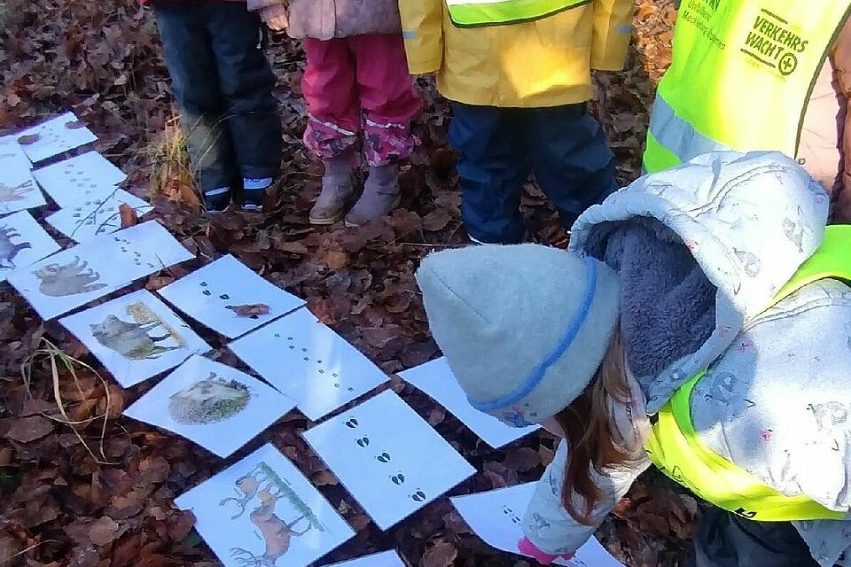 Besonders eindrucksvoll waren die Aufnahmen der Wildkamera, die uns zeigte, wer den Wald noch bewohnt. Im Anschluss ordneten die Kinder Waldtiere ihren Spuren zu und konnten echte Felle ertasten. Auch die Größen der Tiere ließen sich an markierten Baumstämmen vergleichen – eine eindrückliche Erfahrung, die den Tieren des Waldes ein klares Bild gab.