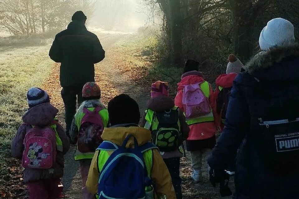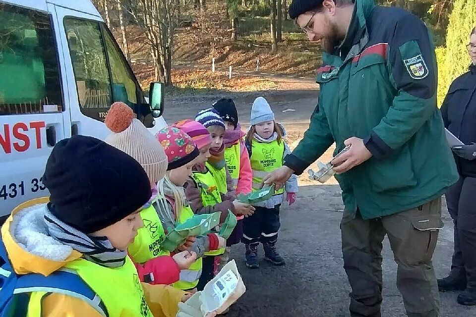 Schon die Fahrt im DRK-Kleinbus war für die Kinder ein kleines Abenteuer. In Jülchendorf erwarteten uns Revierleiter Jannik und zwei Schülerpraktikantinnen, die uns herzlich aufnahmen und direkt mit in ihren Wald nahmen. Unter strahlendem Sonnenschein konnten die Kinder ihre Sinne öffnen und den Wald mit all seinen Geräuschen, Farben und Gerüchen wahrnehmen.