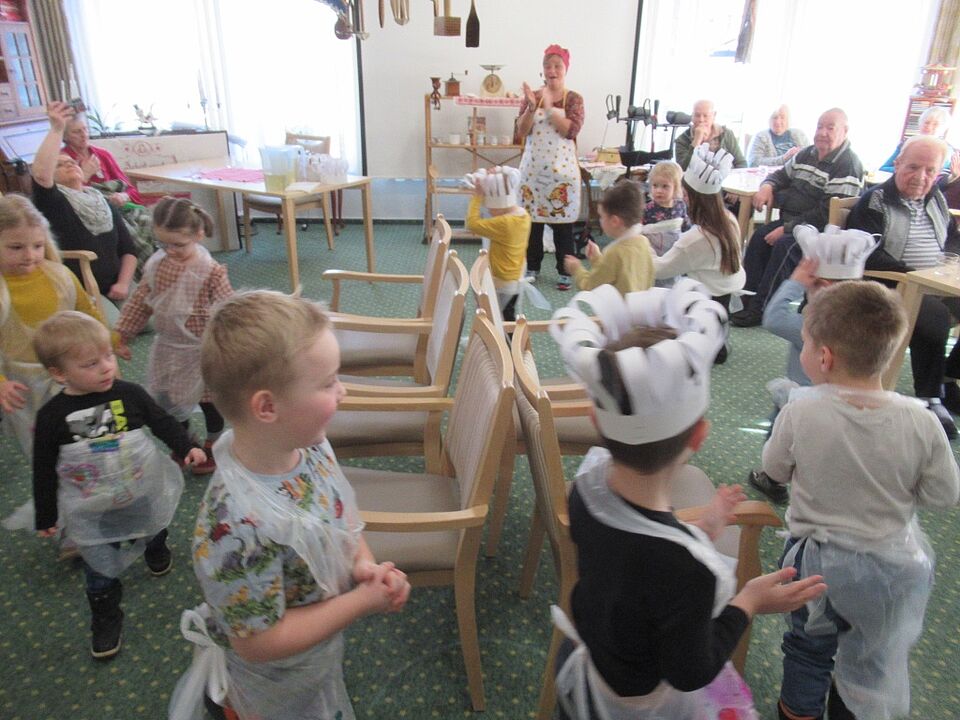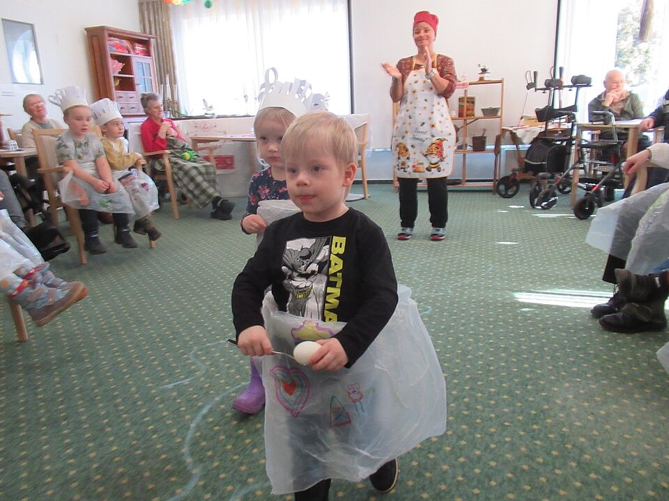 Ein besonderes Erlebnis war der Besuch einiger Kinder in der Seniorenanlage. Dort wurde gemeinsam Fasching gefeiert. Bei Eierlauf, Sackhüpfen und Stuhltanz wurde gelacht, angefeuert und mitgefiebert.