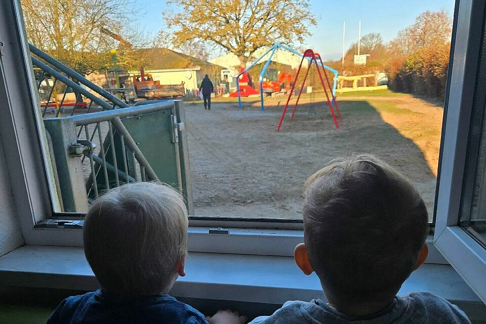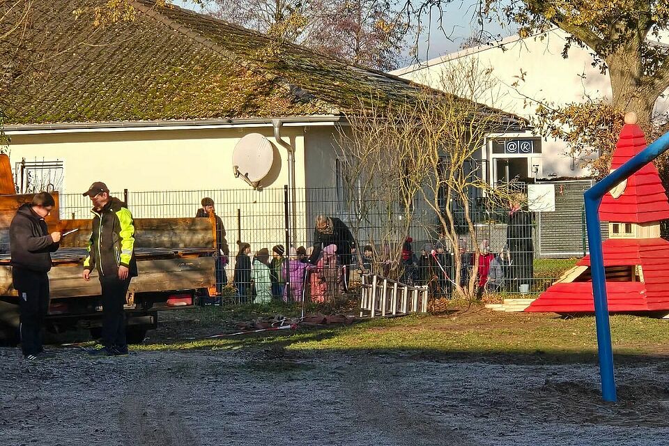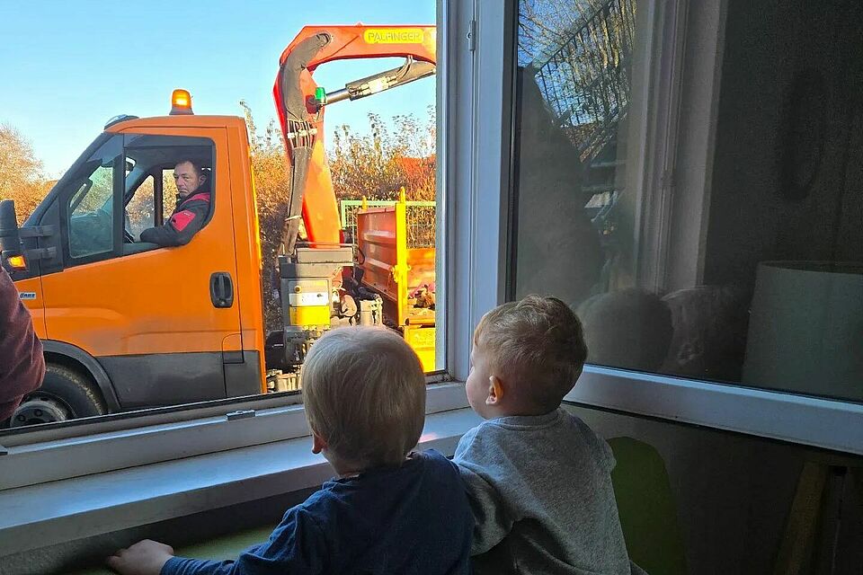 Voller Erstaunen stehen unsere kleinen „Baggerfans“ an den Fenstern der Cafeteria. Draußen passiert Großes: Baufahrzeuge bewegen sich über das Gelände, graben die Erde um und bereiten den Boden für die neuen Spielgeräte vor. Ein großer LKW entlädt nach und nach die liebevoll ausgewählten Elemente, die schon bald das Spielen, Klettern und Entdecken ermöglichen werden.