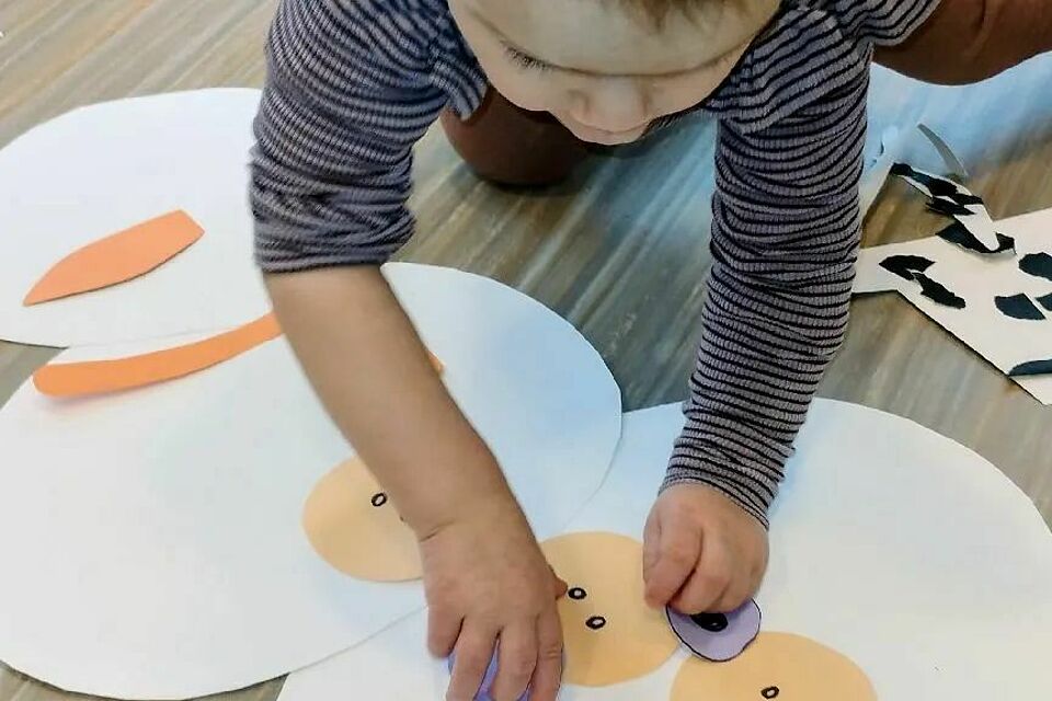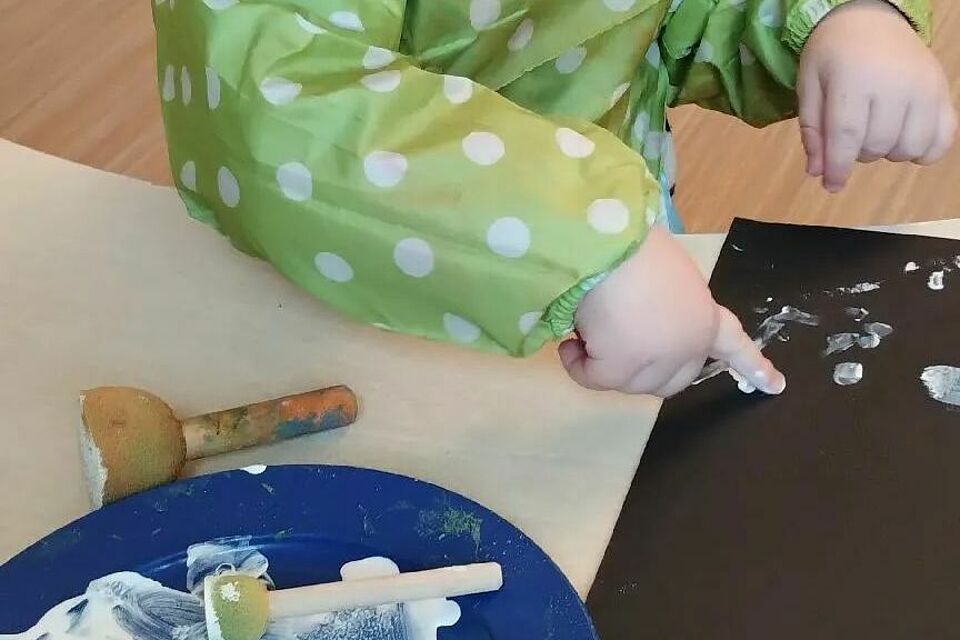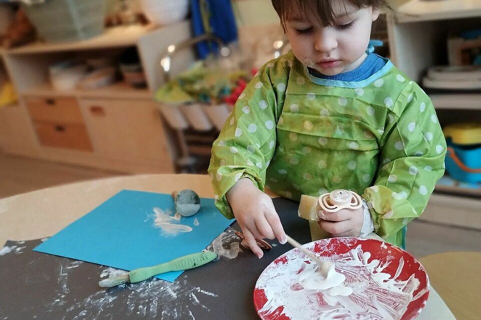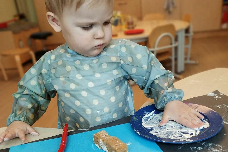 Anschließend zieht der Schnee ein. Mit weißer Farbe wird gemalt, getupft, gestempelt und auch mal mit den Händen experimentiert. Pinsel, Schwämme und Finger hinterlassen ihre Spuren und sorgen für staunende Blicke. Hier zählt nicht das Ergebnis, sondern das Erlebnis: fühlen, lachen, ausprobieren und stolz sein auf das, was entsteht.