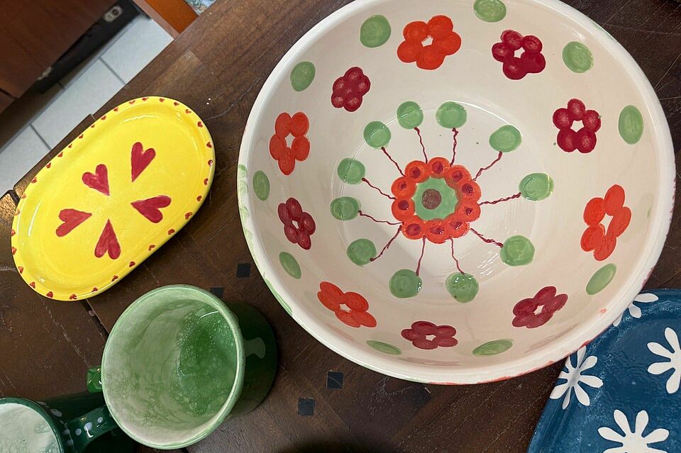 Es prickelt jedes Mal aufs Neue: der Ofen öffnet sich, und plötzlich leuchten Tassen, Teller und Schüsseln in fröhlich bunten Farben. Was vorher nur Pinselstriche waren, ist jetzt echte, glasiert-glänzende Keramikkunst – jede einzelne ein kleines Highlight!