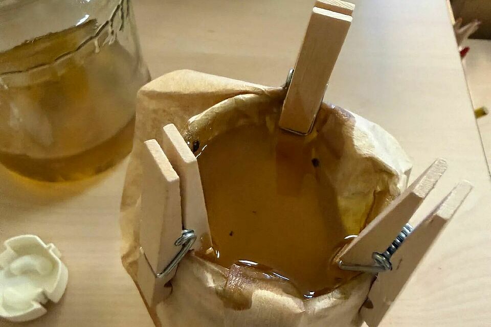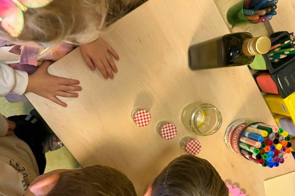 In der Kita wurde es dann richtig kreativ. Aus dem gesammelten Harz stellten die kleinen Naturforscher ihre eigene Fichtenharzsalbe her – ein duftendes, warmes Gemisch, das bei Schürfwunden die Heilung unterstützen kann. Mit großer Begeisterung rührten und probierten die Kinder, bis ihre ganz persönliche “Waldapotheke” fertig war.