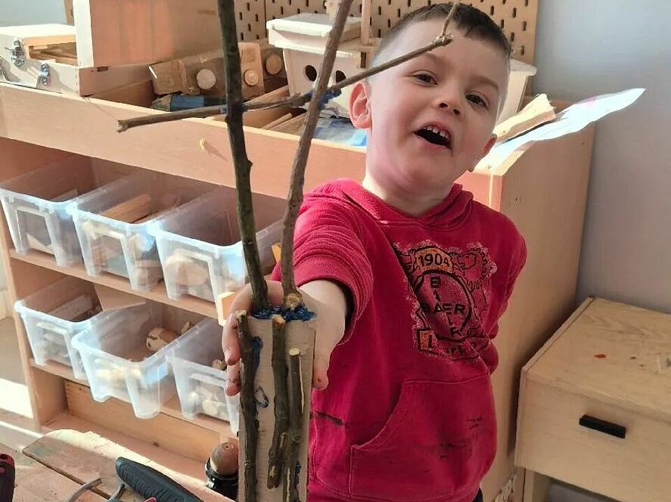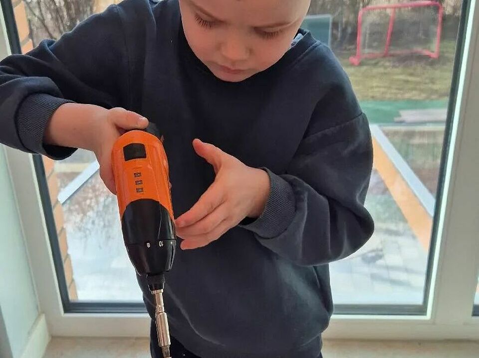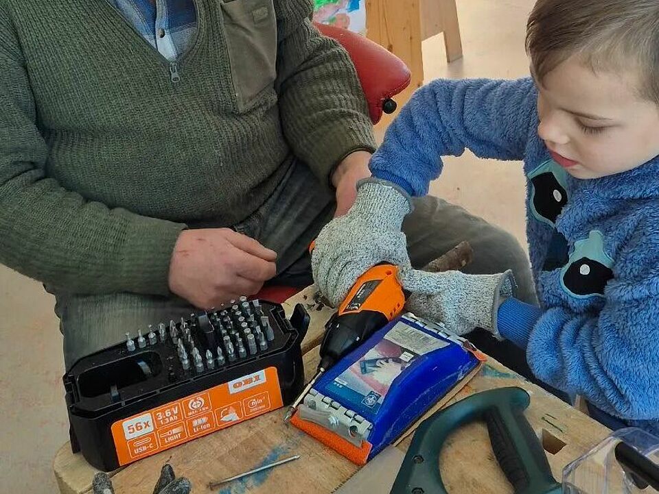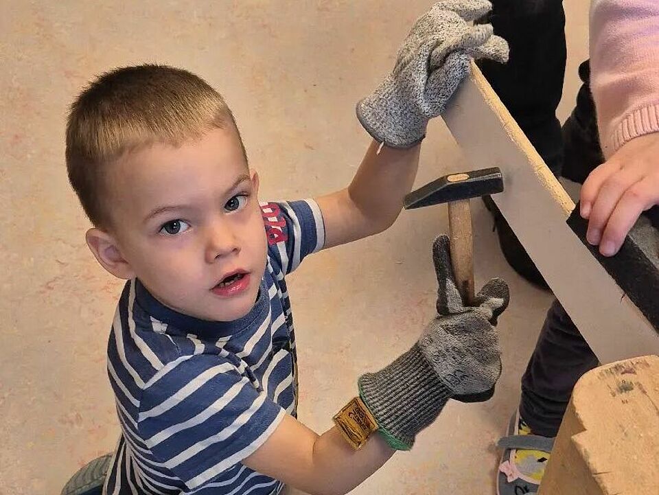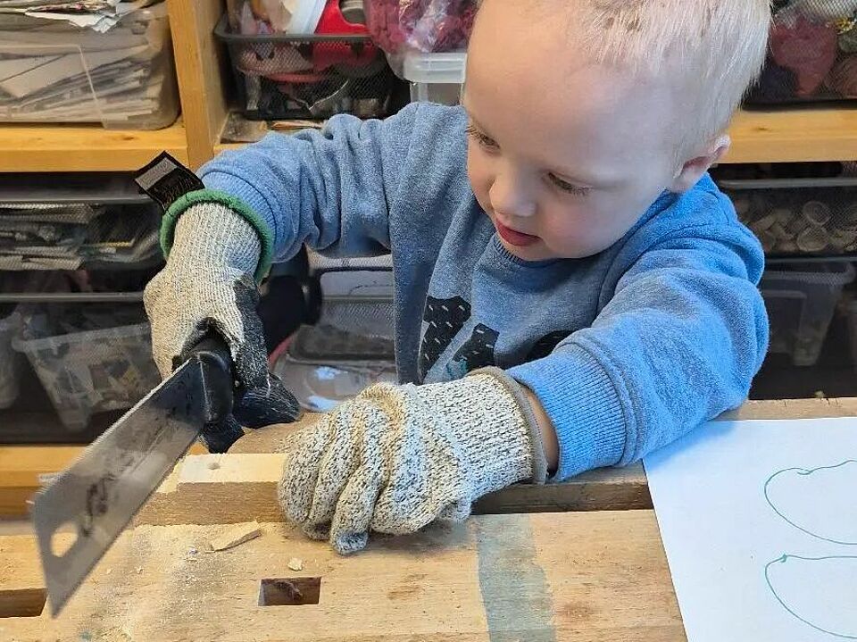 Zweimal in der Woche arbeiten die Kinder hier mit echtem Werkzeug. Begleitet werden sie von unserem „Opa Burkhart“, der mit viel Geduld, ruhiger Hand und einem feinen Gespür für Kinderfragen zeigt, wie Hammer, Säge und Akkuschrauber sicher eingesetzt werden. Mit Handschuhen, klaren Regeln und einer großen Portion Neugier lernen die Kinder Schritt für Schritt, Verantwortung für Werkzeug und Material zu übernehmen.