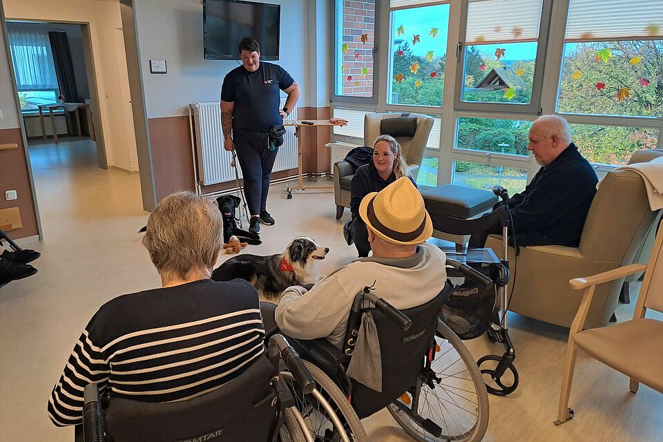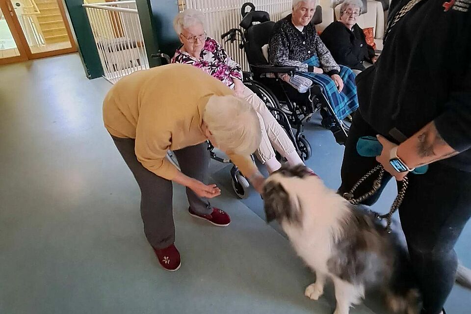 Schon beim Eintreffen der Besuchshundeteams Lupin mit Lisa und Kira mit Sarah war spürbar, welch besondere Atmosphäre diese Begegnung mit sich brachte. Ein leises Lächeln hier, ein strahlender Blick dort – es waren die kleinen Gesten, die diesen Nachmittag so wertvoll machten. „Hunde sind die besseren Menschen“, bemerkte ein Bewohner schmunzelnd – ein Satz, der den Zauber des Moments treffend einfing.