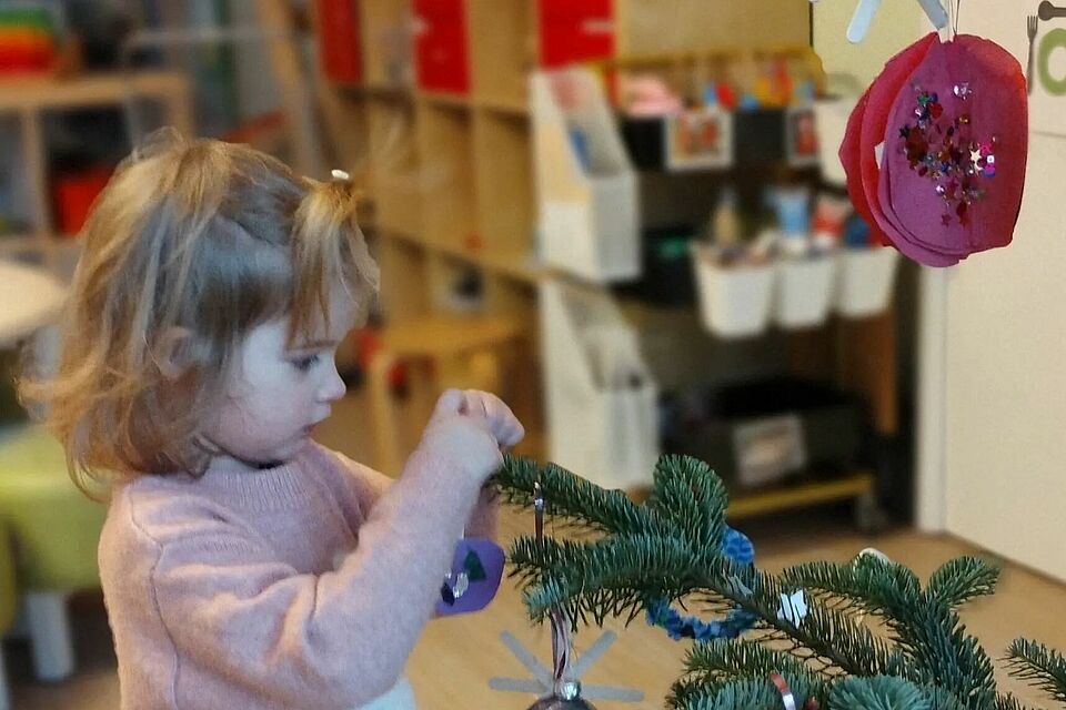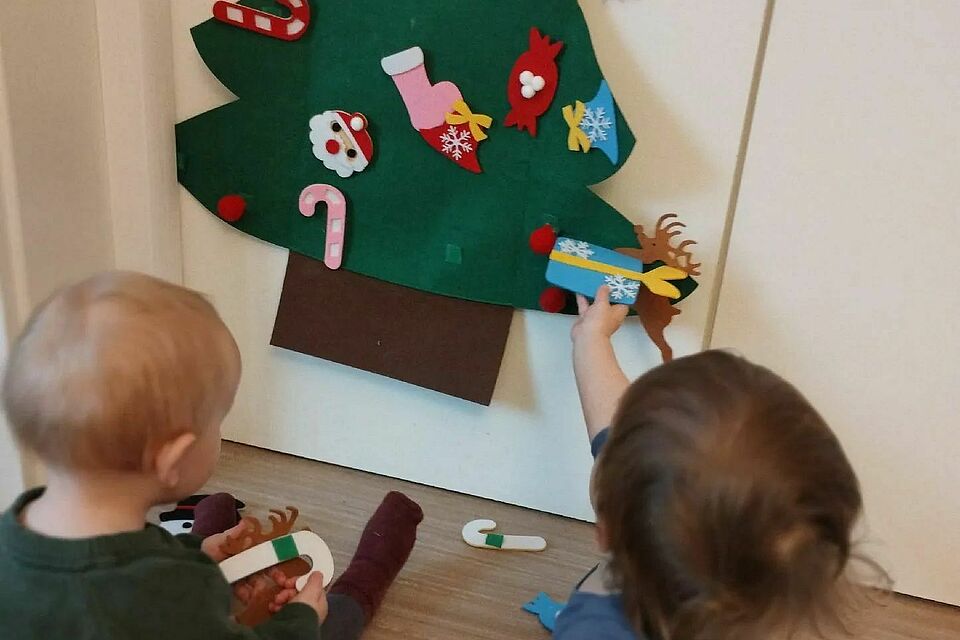 Auch im Krippenalltag funkelt die Vorfreude weiter. Unser Filz-Weihnachtsbaum, der immer wieder neu gestaltet werden kann, lädt zum Ausprobieren, Ordnen und Verändern ein. Spielerisch entdecken die Kinder Formen, Farben und Zusammenhänge – und tauchen dabei ganz nebenbei tiefer in die besondere Stimmung der Adventszeit ein.