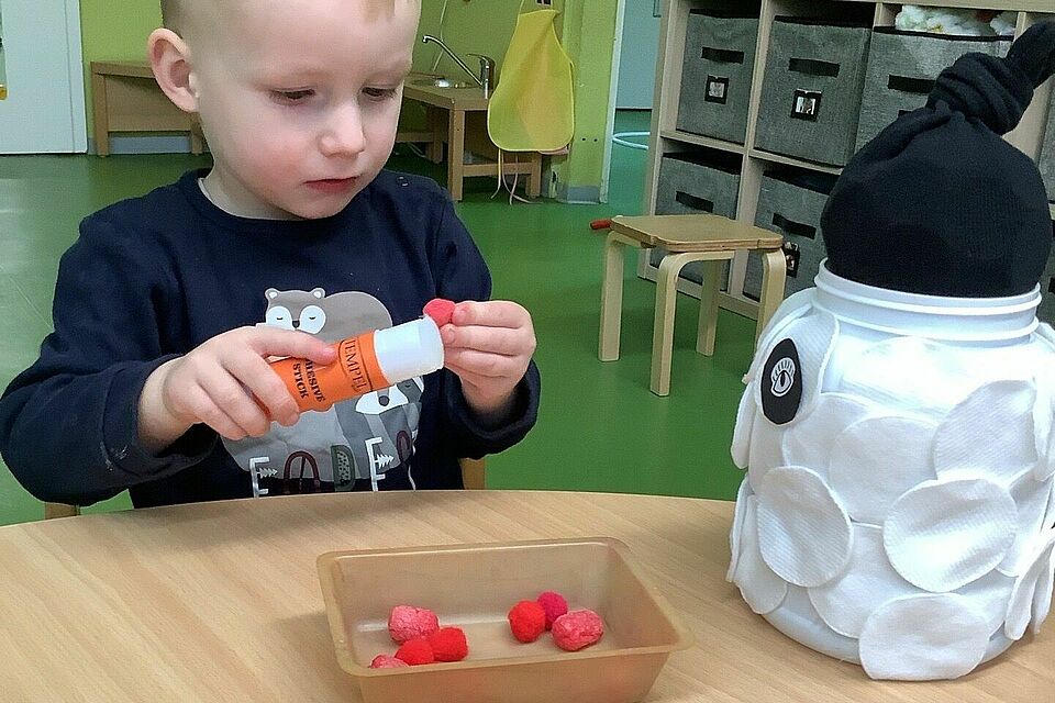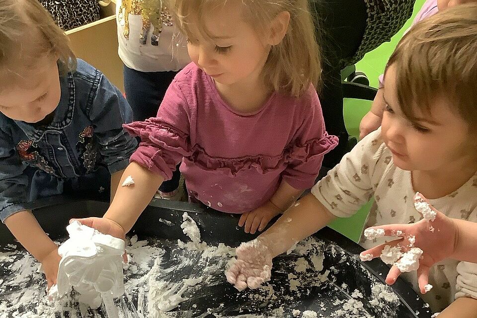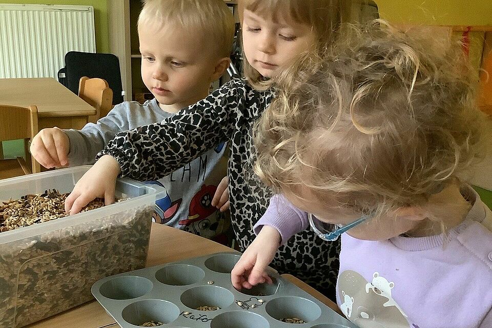 Nicht nur drinnen wird es winterlich: Wir gestalten gemeinsam die Räume und stellen sogar unseren eigenen Schnee her. Jedes Kind erlebt dabei die Materialien auf ganz besondere Weise – von der kühlen Feuchtigkeit bis zum glitzernden Weiß. Auch an die Vögel draußen haben wir gedacht: Selbst hergestelltes Futter sorgt dafür, dass unsere gefiederten Freunde gut versorgt sind und die Kinder lernen, Verantwortung zu übernehmen.