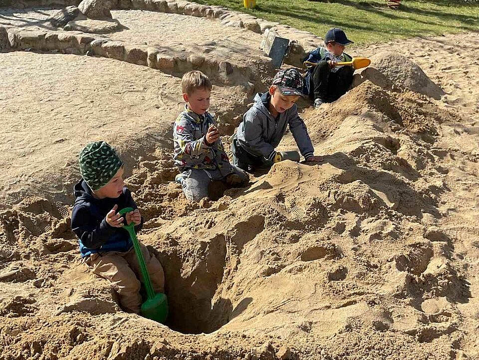 Auch unser Kita-Hof verwandelte sich in den letzten Tagen in eine echte Baustelle. Mit Schaufeln und voller Tatendrang gruben die Kinder Gräben entlang des Sandkastens, schütteten Hügel auf und bauten sogar ein großzügiges Sandsofa. Dabei wurde nicht nur gebuddelt, sondern auch jede Menge koordiniert und gemeinsam geplant.