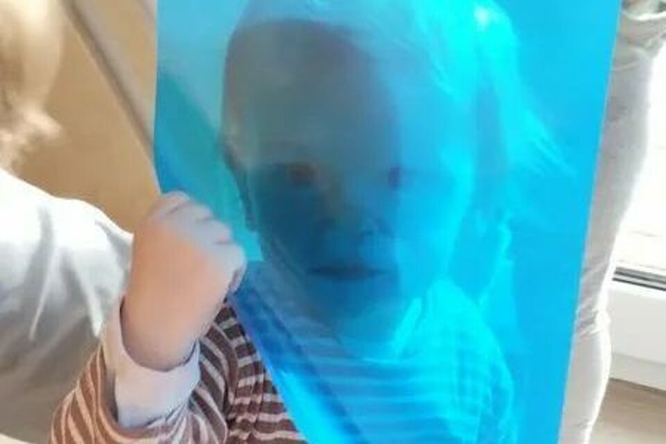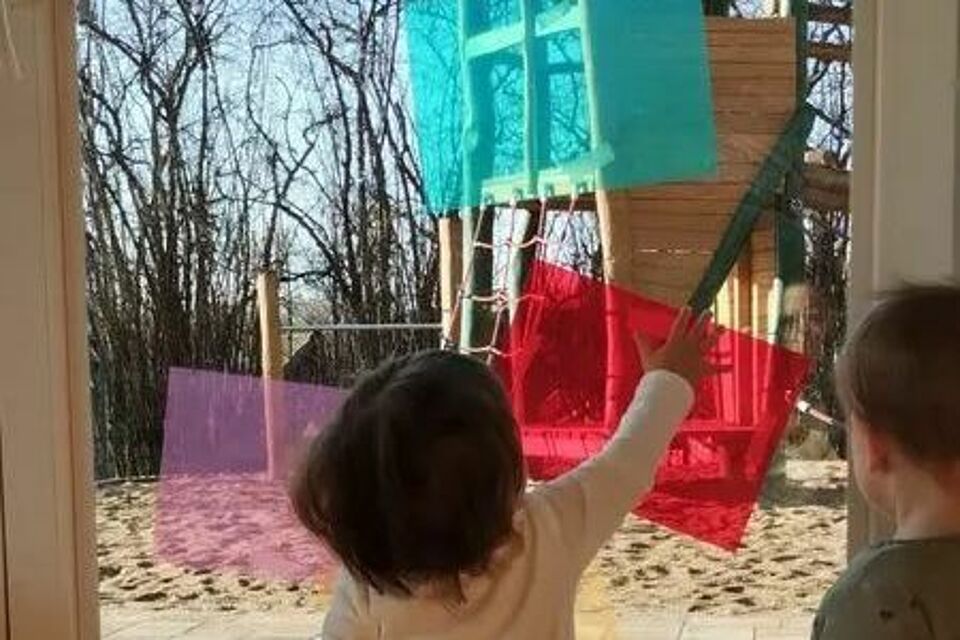 Besonders schön war der Moment, als wir einige Folien gemeinsam an die Fenster klebten. Das Licht strahlte hindurch und verwandelte unseren Raum in ein flimmerndes Farbenmeer. Wir staunten mit den Kindern über die tanzenden Reflexe auf Wänden und Boden – und freuten uns über ihre Begeisterung, die sich in neugierigen Blicken und fröhlichem Ausprobieren zeigte. Für uns als Team ist es ein besonderes Glück, zu sehen, wie die Kinder durch spielerisches Entdecken ihre Welt begreifen, miteinander teilen und dabei immer neue Ideen entwickeln.
