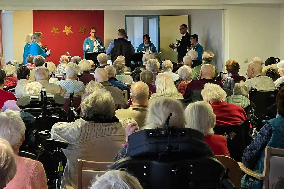 Der Raum war bis auf den letzten Platz gefüllt. Bewohner:innen aus dem Betreuten Wohnen, dem Pflegeheim und Seniorenzentrum in Sternberg rückten näher zusammen, manche lächelten, manche hielten die Hände, als würden sie die Töne festhalten wollen. Dann begann der Handglockenverein Dabel zu spielen. Jeder Ton schwebte leicht, klar und festlich durch den Raum. Manche Augen glänzten, andere Köpfe nickten im Takt – und wir spürten alle gemeinsam: Das ist Weihnachten. Ein Moment, in dem Musik verbindet und den Alltag für einen Augenblick stillstehen lässt.