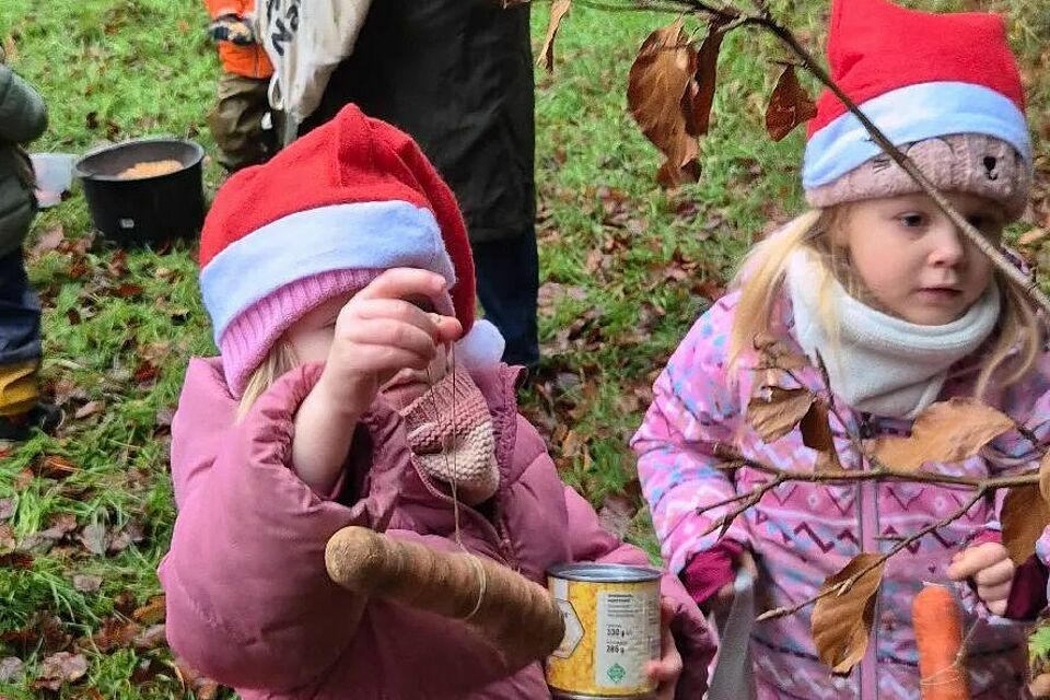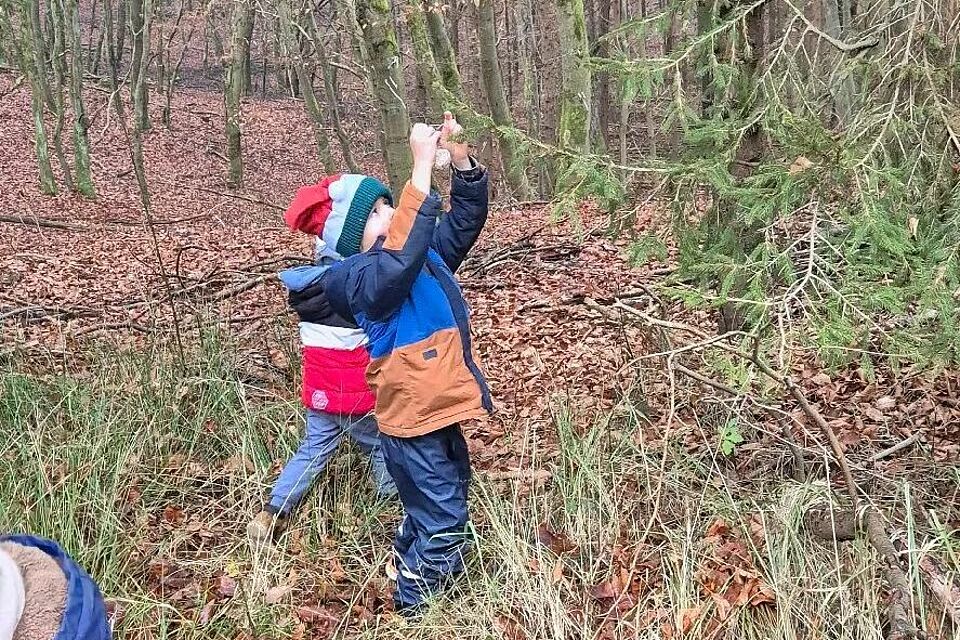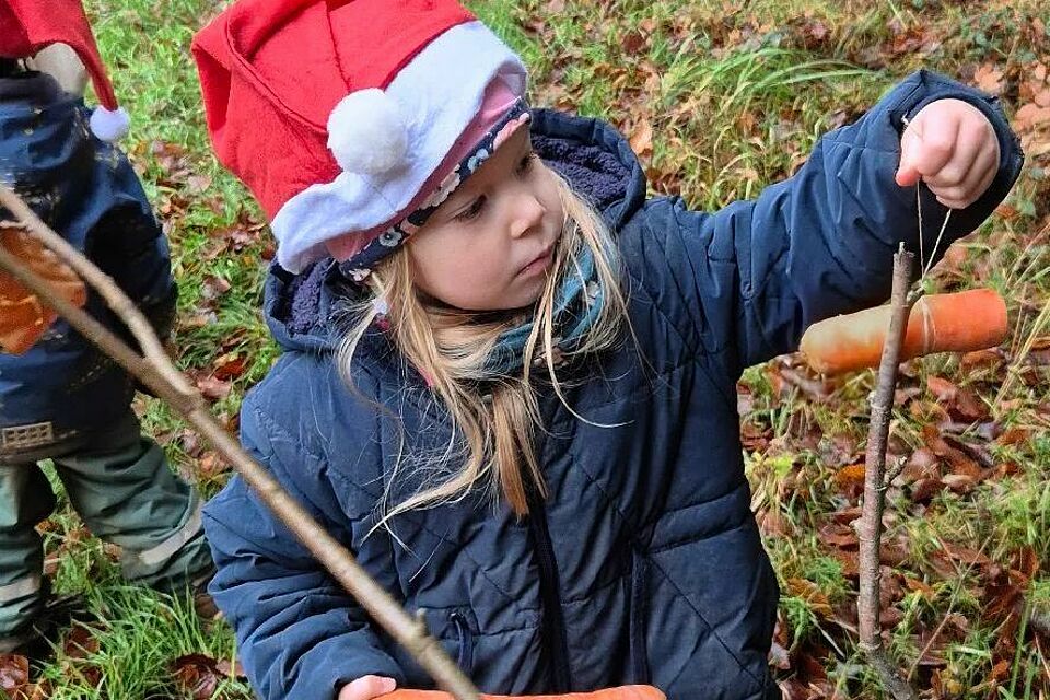 Das große Highlight wartete im Wald: Mit unserem Förster schmückten die Kinder einen Weihnachtsbaum für die Waldbewohner – mit Möhren, Äpfeln und Mais. Stolz und voller Freude legten wir ihn gemeinsam auf die Erde und trugen ihn zum Auto. Doch damit nicht genug: In der Kita wartete schon unser Schoko-Weihnachtsbaum! Die Kinder hängten Schoko-Anhänger auf, die gleich vernascht wurden, und dekorierten ihn weiter mit selbstgebasteltem Schmuck.
